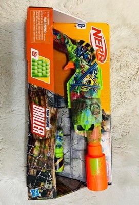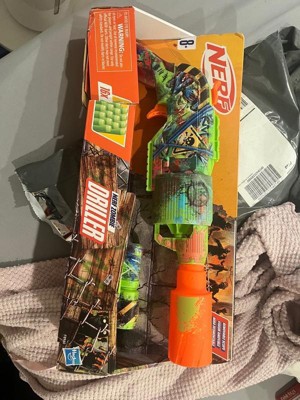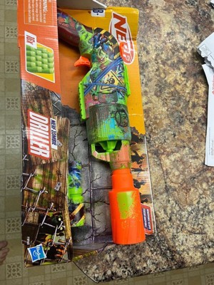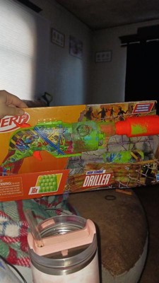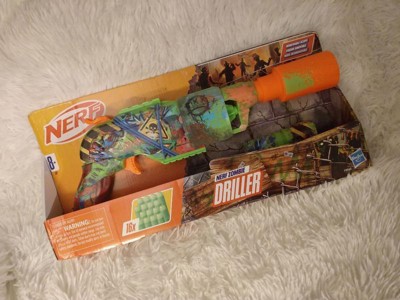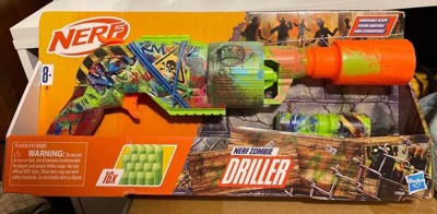 - NERF ZOMBIE DRILLER DART BLASTER: Get ready for battle with the Nerf Driller blaster! It captures the look of zombie fighting gear and is covered in cool graffiti designs on both sides