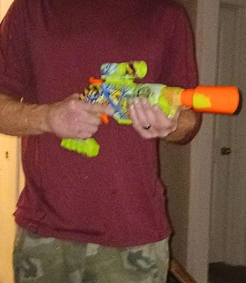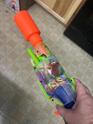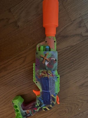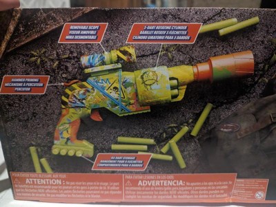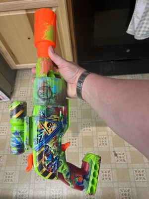 The Nerf Zombie Driller dart blaster is fully decorated with colorful, eye-grabbing, and zombie-inspired graffiti designs on both sides. The blaster's design creates the look of battle gear that zombie fighters would engineer in a world overrun by the ghoulish undead. The Zombie Driller blaster is designed to look like a drill that's been turned into a zombie fighting blaster. It has a rotating cylinder with 5-dart capacity and includes 16 Nerf Elite foam darts and a removable Nerf scope. Featuring fun details from end to end, the Nerf Zombie Driller blaster is great for zombie fans and a perfect accessory for zombie parties, games, and events. Nerf toy blasters are great indoor and outdoor toys for kids ages 8 and up to enjoy fun, active play. Each sold separately, subject to availability. Eyewear recommended (not included). No batteries required.