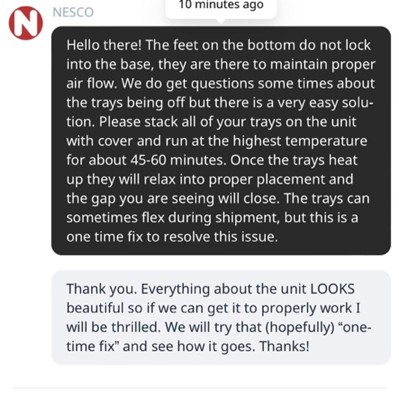 … it’s pretty loud. Was impressed upon opening the box. Everything was packaged well and all parts appeared sturdy and solid. Inclusion of both jelly roll and fine mesh screens for all 8 of the trays is a nice bonus. However, after washing everything and assembling for first use, we noticed that the first tray did not sit flush against the base which made all the trays wobble. Before revoking and returning though, I had a chat with Nesco customer service and they had an easy solution to the tray issue. Just wished they included something in directions because I read a number of reviews addressing the same thing; those reviews called it warping while I called it wobble.