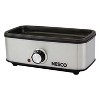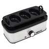 The Nesco Egg Cooker allows you to cook up to 8 eggs to hard-, medium-, or soft-boiled consistency in minutes! You will never have to wonder if your eggs are done. Simply use the piercing pin to puncture the eggs, add the proper amount of water to the heating base, turn on the egg cooker, and wait for the auto shutoff alarm to sound. It's ideal for deviled eggs, egg salad, or poached eggs for eggs Benedict. The measuring cup with piercing pin prevents shells from cracking and ensures perfect eggs every time. The egg cooking tray holds up to 8 eggs and the poaching tray allows you to poach up to 3 eggs at a time. This cooker features an attractive and stylish stainless steel wrap. All non-electrical components are BPA-free and dishwasher safe. _