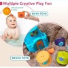- FREE BONUS Frog Bath Toys: This set contains 8 colourful cups with animals, 4 geometric shape blocks, a castle, a rattling rabbit, and a free swimming frog. Stack, nest, sort, build, count, knock down, rattle shaker, shape sorter, water play, beach play and other creative play. A great interactive indoor and outdoor toy set that keeps babies 6 months to 3 years old busy and entertained.