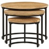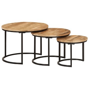 - This set of nesting tables is made from solid mango wood, showcasing a lovely finish that highlights the unique grain of each piece. The sleek and modern design, together with sturdy powder-coated legs, makes these tables a great addition to any room, whether you're having a brew in the living room or showing off some decorative bits in the bedroom. Unique Design: The industrial style of these tables adds a touch of sophistication that works with various decor. Their simple yet striking look brings character to any contemporary setting.Space-Saving: Stackable design makes them easy to store when not in use, making them ideal for tighter spaces.Handcrafted Beauty: Each table's solid mango wood is a natural product, resulting in distinct grains. This uniqueness not only looks great but also makes each piece one-of-a-kind.Versatile Use: More than just furniture; these tables can serve multiple purposes for serving coffee, acting as nightstands, or casual snack tables.Durable Construction: Built to last, featuring strong legs made from powder-coated iron. This setup means they can withstand everyday use while looking good. Number Of Items: 3Color: BlackShape: RoundMaterial: Solid Mango woodFinish: PolishedIndoor/Outdoor: Indoor OnlyCover Included: NoRoom: Living RoomMaximum Number of People: 3Weight: 20.41 lbsDelivery Contains: 3 x Coffee tableAssembly Required: YesRecommended Number of People for Assembly: 1