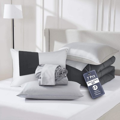 Nestl Twin XL Size Comforter Set, 7 Piece Pintuck Twin XL Bedding Set Grey Lavender, Dorm Room Essentials Bed in a Bag Twin XL with Cooling Pillows