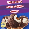 Vanilla - CONTAINS: MILK, WHEAT AND SOY INGREDIENTS. MAY CONTAIN PEANUTS., Vanilla Caramel - CONTAINS: MILK, WHEAT AND SOY INGREDIENTS. MAY CONTAIN PEANUTS., Vanilla Fudge - CONTAINS: MILK, WHEAT AND SOY INGREDIENTS. MAY CONTAIN PEANUTS.Form: Cone