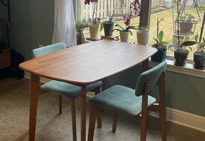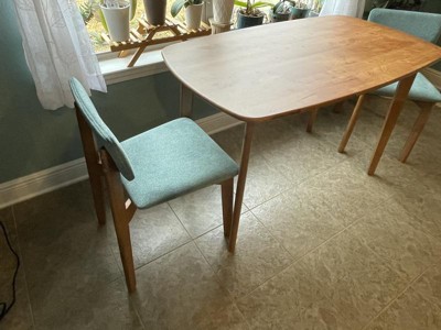 This table is perfect. It’s just myself and my boyfriend living in our small apartment so we don’t have space for large furniture. This fits two chairs very nicely. It looks very modern and sleek and the wood seems good quality. Assembly was very easy; I did it in 15 minutes after work. It was also packaged very well. I highly recommend this for the low price.