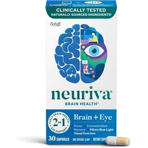 Neuriva Brain + Eye Capsules provide comprehensive brain and vision support in a 30-count supply. Formulated with clinically studied ingredients, these capsules are designed to support focus, memory, and eye health. Each serving combines brain-supportive nutrients with antioxidants for visual function. Convenient for daily use, Neuriva emphasizes trusted quality, making this supplement a dependable choice for cognitive and eye wellness.