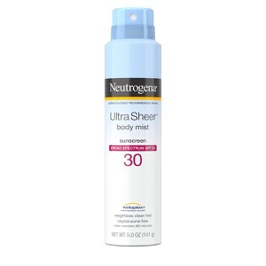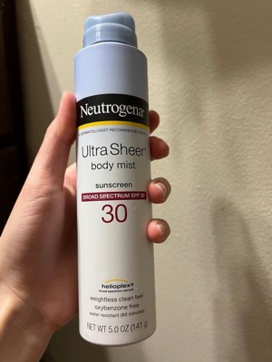 Neutrogena Ultra Sheer Body Mist Sunscreen Spray with Broad Spectrum SPF 30 provides powerful sun protection that you will love to wear to help prevent sunburn. Featuring an oxybenzone-free formula and with Helioplex technology, this non-greasy sunscreen provides superior UVA/UVB protection in an easy-to-apply spray format. The sunscreen spray formula also absorbs quickly with a sheer, ultralight finish and a weightless, clean feel. This SPF 30 sunscreen mist is non-comedogenic and oil-free, so it won't clog pores and, when used as directed, may decrease the risk of skin cancer caused by the sun. Convenient for on-the-go, the easy-to-use spray can provides no-mess application for face and body. This spray sunscreen is water-resistant for up to 80 minutes and comes from the #1 dermatologist recommended sun care brand. Apply prior to sun exposure to protect skin during outdoor activities like gardening, biking, hiking, boating or going on a walk.