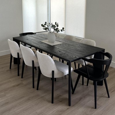 The chairs are beautiful. Black legs are a smooth finish. Seat is a little firm, but it’s still comfortable to sit in. The fabric is more of a white/beige color.