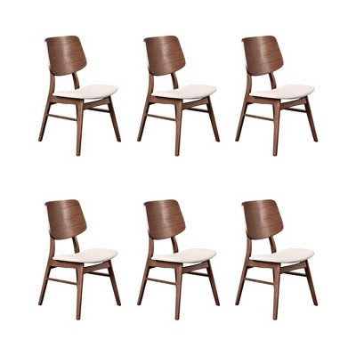 The Oscar Dining Chair exemplifies the clean, simple lines of the Mid-Century Modern era. Crafted of solid Rubberwood and Walnut veneers, this sleek chair has tapered legs crafted of solid wood for durability and style, adding the modernist flair characteristic of Mid-Century Modern furniture. 100% natural beige polyester seat cushions are shaped for comfort and accented by the gently curved backs. The natural walnut grains and coloring are enhanced by the clear finish completing the sleek, Scandinavian inspired chair. An ideal chair for your dining room, office chair, accent chair or anywhere you need a touch of contemporary style.