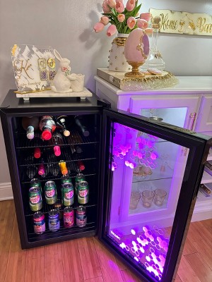 I absolutely love this fridge, it's so pretty! Not only it can hold up to 85 cans of beverage and snacks, it looks sleek and modern, perfect for my gaming room. The RGB lighting is bright and beautiful, it also doubles as decor for my gaming setup, and the prismatic effect on the glass door adds such a unique, cool look. It's also really quiet, I can barely hear a thing. Highly recommended!