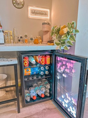 I got this mini fridge for my coffee bar in our game room and it is exactly what I was looking for. It holds so many beverages and the RGB lights are so customizable and pretty! I would definitely recommended purchasing this fridge!