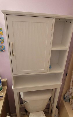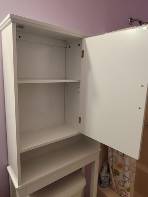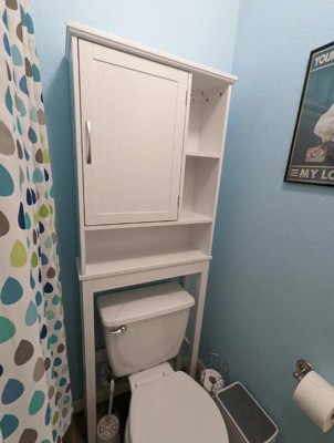 [This review was collected as part of a promotion.] This is exactly what I needed for my master bathroom to store lots of cleaning products. With this cabinet stand I have so much more room to store items conveniently without clutter and mess. Wanted a cabinet with door and solid shelves and this is perfect! Looks much more expensive than it is. This was a fairly easy piece to assemble and it actually looks nice. This is a great storage space for over the toilet. Its bright white and sturdy. The doors and shelves provide the perfect amount of space for things to be hidden as well as displayed. Fits great and looks great.I recommend this item for anyone with a small bathroom that needs added storage.