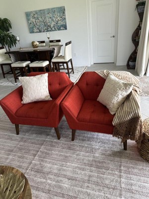 A lovely persimmon colored chair with a mid-century mod feel. It is comfortable for the small price tag. I find it is most comfortable with a stool about the same height in front of it.