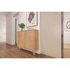 - With its shallow depth, this piece of furniture, highlighted by its hairpin legs, offers discreet storage space on two internal shelves behind its double doors in Natural Maple finish