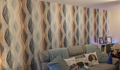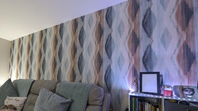 A full roll of this product is 20.5 inches wide and 396 inches long. A full roll can cover up to 56 square feet depending on the design match and pattern repeat. A sample of this product is 8 inches by 11 inches. This stunning wallpaper features a watercolor effect geometric pattern in an eye-catching color combination of terracotta’s mixed with blue tones and hints of soft neutrals. This beautiful design is inspired by the Ikat technique of dying threads and is sure to transform any room into a serene living space. It is printed on a matte paper that creates a subtle contemporary feel. Offers a smooth, untextured finish. Offset match with 20.5 inch pattern repeat.
