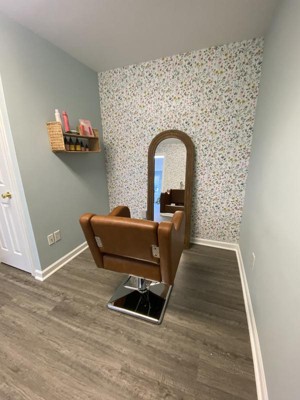 This is a super user-friendly pattern for wallpaper beginners and easy to use for professionals. Had no issues lining up. Has a mix of pink, blue and yellows within. My advice: Don’t assume your walls are straight and go with the visual line-up!