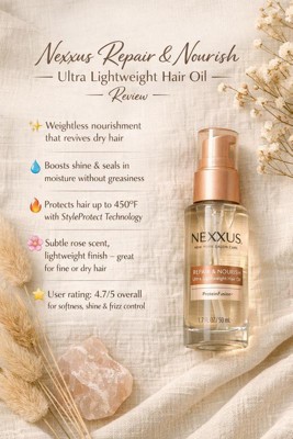 [This review was collected as part of a promotion.] I’ve been using the Nexxus Repair & Nourish Ultra Lightweight Hair Oil both during the day and at night, and I’m really impressed with how light it feels. I usually apply a small amount to damp hair before blow-drying, and it instantly makes my hair feel smoother and more manageable without looking greasy. At night, I use it on my ends to help with dryness, and I wake up with softer, healthier-looking hair. The scent is subtle and pleasant—not overpowering—which I really appreciate. The texture absorbs quickly and doesn’t weigh my hair down, even though I have finer strands. My hair looks shinier and feels stronger after regular use. I’m giving it 4 stars because while it works great for hydration and frizz control, very dry hair types may need a heavier oil for deep moisture. I received this product for free from Topbox Marketing for testing and review purposes.