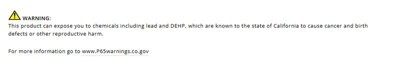 WARNING:This product can expose you to chemicals including Lead and DI (2-ethylhexyl)phthalate (DEHP) which are known to the State of California to cause cancer or birth defects or other reproductive harm. For more information, go to https://www.p65warnings.ca.gov/