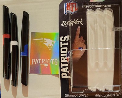 [This review was collected as part of a promotion.] These body markers are a fun way to add that extra flair and show your team spirit! they come with 3 markers and New England Patriots stencils. We used the markers with and without the stencils to create fun body art. The markers are easy to use and the ink stays in place for a long time. Clean up is simple with soap and water.