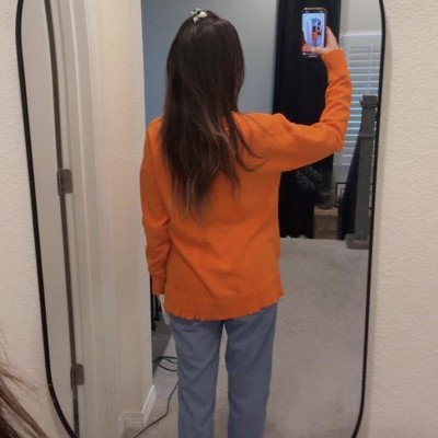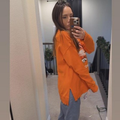 NOTHING like the photos! The photos online look like a short fitted acid wash top. This is super vibrant, orange, solid, definitely not acid wash. And it’s really Long compared to the photos online. That may be your style, but it’s definitely not why I purchased it.