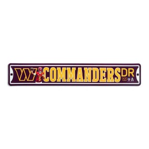 Celebrate your Washington Commanders pride with this bold metal sign that brings team spirit front and center. Featuring the classic burgundy and gold color scheme, the iconic Commanders logo, and a striking player graphic, this piece commands attention. The “Commanders Dr.” text gives it a street-sign feel that’s perfect for any dedicated fan’s space. It’s a standout addition to any game room, office, or Commanders collection.