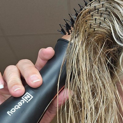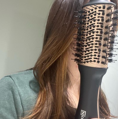 [This review was collected as part of a promotion.] Super excited this was listed to review. I've used similar in the past, and while convenient, had to stop using due to the bristle type on the brush combined with the heat, causing breakage and damage to my hair. This blowdryer brush has a ceramic core/shaft for even heat distribution, with a few preset temps to choose from, and nylon bristles spaced out far enough as to not pull your hair and cause breakage. My hair glided through it with ease, and although I did still see hair in the bristles after, it was less than in previous ones I've used, and equivalent to what'd I'd normally see in my regular hair brush. It did take more time to dry than my regular hair dryer, but gave the convenience of keeping my crazy wavy curly frizzy hair under control in less steps. I did use a heat protectant, and will touch up my hair with a hot iron to make it more sleek. I received an incentive to write this review.