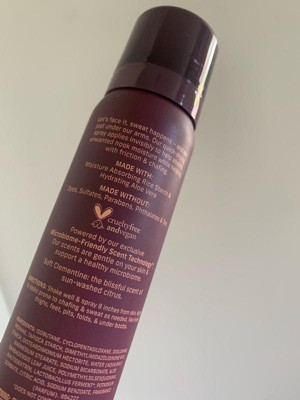 [This review was collected as part of a promotion.] This sweat absorbing and chafing barrier spray is a godsend for the thick thigh girlies out there. Works just as good as deodorant without the mess and has a scrumptious orangey fragrance to help things stay fresh in that area. I find that the anti chafing lasts all day even through heavy sweat, though the scent fades after a couple hours. I also love being able to use this spray on other sweaty areas to help keep me less than musty ‘til I can get to a shower!