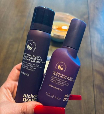 [This review was collected as part of a promotion.] I received this product in the Soft Clementine scent, not Airy Vanilla…. Niche and Nooks body and fabric fragrance mist in Soft Clementine has a clean and citrusy scent that awakens your senses. I like to spray it on my sheets and comforter after making my bed every morning. It doesn’t irritate my skin. This spray instantly freshens my bedroom!