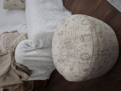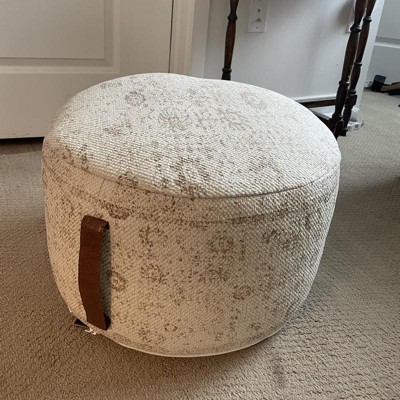 Bring a storied look while adding comfort to your space with this vintage-inspired pouf from Nourison. Charming and practical, the textured cotton cover features a faded floral pattern and faux leather carry handle for convenient placement in any room. This handmade pouf is filled with polystyrene beads for a soft yet firm cushion that comfortably supports your feet while you relax with a book or in front of the TV. Pair with our matching throw pillow for a more cohesive look.
