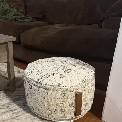 I never owned a pouf, but always knew how popular they were. I finally purchased this one and absolutely love it! It's soft, lightweight and not bulky , so it's easy to move anywhere in the house. Love the ivory and blue print with a nice brown faux leather handle on the side.