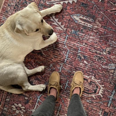 I’m a designer and pretty picky about the rugs in my house. I have a lovely 80 year old Persian rug that is just too nice to have in the living room with my pup who loves dirt. Washable rugs are kinda terrible looking and hard to shop online and a lot of them are insanely priced. I ordered a couple of rugs online and this was the winner. It’s not my Persian rug, but it adds a lovely warm layer. The pile is super low but soft to touch. Plus, you can’t beat the price. I’ve had to for a couple of days, and so far it’s holding up to indoor digging sessions 😂
