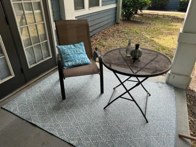 [This review was collected as part of a promotion.] Love my new outdoor rug. It is perfect for under my table. The best part is that the color is a good shade of blue. I recommend getting this outdoor rug under your outdoor table.