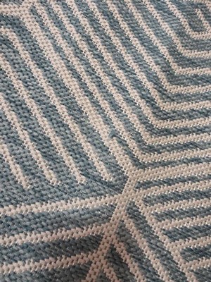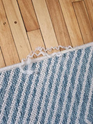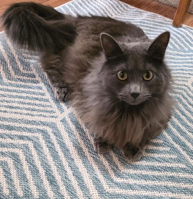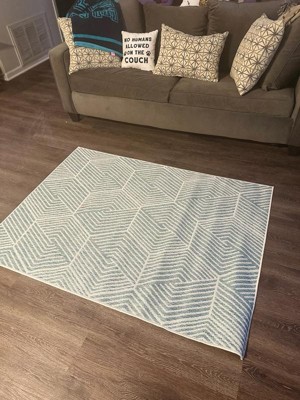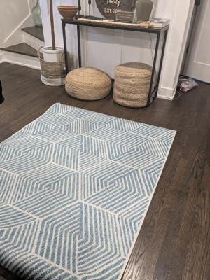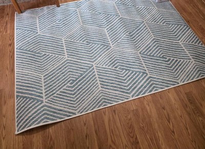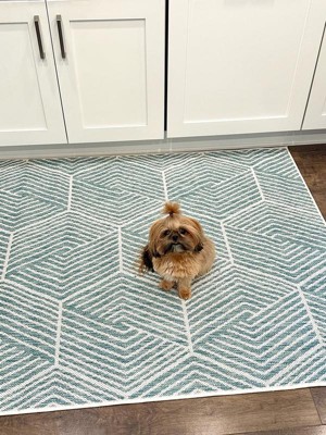 [This review was collected as part of a promotion.] I received the Nicole Miller New York Patio, Country Ombre Geo, Indoor/Outdoor Area Rug, UV Fade Resistant, Low Pile Color: Blue/Cream Dimensions: 3'"11"x5'2". I have used this rug in my dining room and it is super easy to spot clean any messes. It seems durable inside (can't speak on outdoor durability or UV resistance). It also needs a rug pad for indoor use or it will move around on a hard wood floor. Overall, I love the design, the blue geometric shapes are definitely interesting. There was one tiny flaw in the carpet where the blue thread was pulled out (see photo). The rug is animal approved, my cats and dog all seemed interested in it!