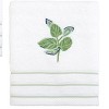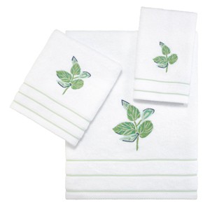 The Nicole Miller Tropiluxe 3-Piece Decorative Embroidered Towel Set features a large-scale tropical motif in shades of green and blue. The white 100% cotton terry towels are finished with light green polyester stripes. Set incl. 1 ea. of: bath (27"x52"), hand (16"x28"), fingertip (11"x18"). Crafted of 100% cotton for softness, absorbency and comfort. Coordinating rug, shower curtain, and bath accessories also available.