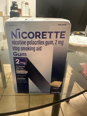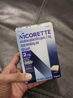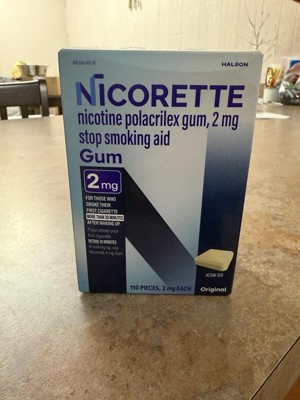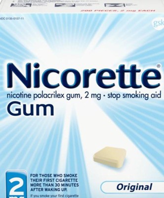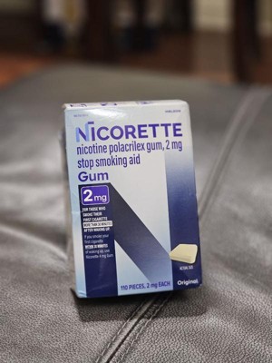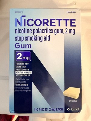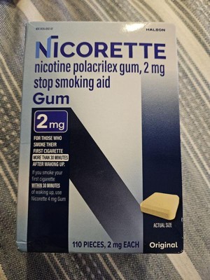 Nicorette 2 mg Nicotine Gum Stop Smoking Aid helps you control your nicotine intake while enjoying the pleasant relief of chewing to help make quitting easier. Made with a special formula to help you gradually kick your smoking habit, this stop smoking gum releases a small, therapeutic dose of nicotine that is slowly absorbed by the body. This OTC nicotine replacement therapy allows you to manage your daily nicotine intake while soothing the cravings, anxiety, frustration, irritability and restlessness associated with quitting smoking. This stop smoking gum gives you the choice to chew a second piece within the hour if you experience strong or frequent cravings, but don't chew more than 24 pieces per day. This 2 mg nicotine gum is the right choice as your smoking cessation aid for those who smoke their first cigarette more than 30 minutes after waking up. To improve your chances of success, chew at least nine pieces per day for the first six weeks of the 12 week stop smoking program with behavioral support. Always read and follow label directions. Start stopping with Nicorette Nicotine Gum, an FDA approved stop smoking aid.