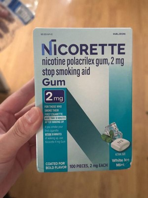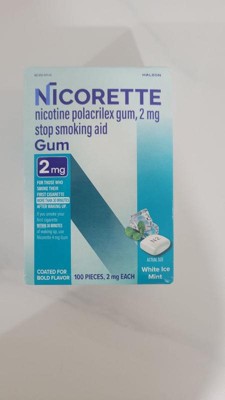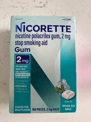 Nicorette 2 mg Nicotine Gum Stop Smoking Aid helps you control your nicotine intake while enjoying the pleasant relief of chewing to help make quitting easier. Made with a special formula to help you gradually kick your smoking habit, this stop smoking gum releases a small, therapeutic dose of nicotine that is slowly absorbed by the body. This Nicorette gum allows you to manage your daily nicotine intake while soothing the cravings, anxiety, frustration, depressed mood, irritability and restlessness associated with quitting smoking. This double coated nicotine gum offers a long-lasting burst of White Ice Mint flavor to help you stick with your quit, giving you the choice to chew a second piece within the hour, always read and follow label directions. This mint gum is a great smoking cessation aid for those who smoke their first cigarette more than 30 minutes after waking up. Complete a 12-week quit program with behavioral support to increase your chances of success. Start stopping with Nicorette White Ice Mint Nicotine Gum, an FDA approved stop smoking aid.