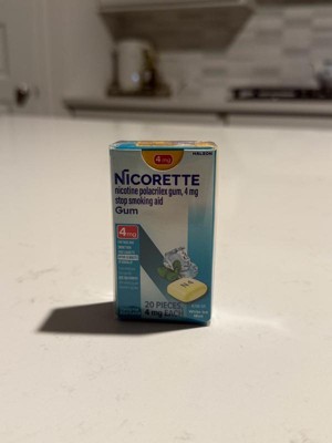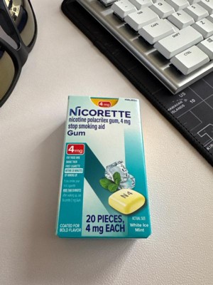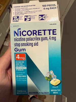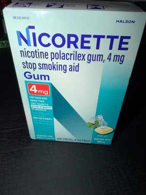 Nicorette 4 mg Nicotine Gum Stop Smoking Aids with Behavioral Support Program helps you control your nicotine intake while enjoying the pleasant relief of chewing to help make quitting easier. This specially formulated smoking cessation gum slowly releases nicotine to combat cravings and reduce anxiety, frustration, irritability and restlessness associated with quitting smoking. With a refreshing and long-lasting White Ice Mint flavor, this coated nicotine gum is a stop smoking gum that helps you stay strong as you kick your smoking habit one craving at a time. Use this mint gum as part of your OTC nicotine replacement therapy if you smoke your first cigarette within 30 minutes of waking up. This stop smoking product also features a Behavioral Support Program to help your quit stick. For best results, chew nine pieces per day for the first six weeks of a 12-week quit program that includes behavioral support. If you're having strong or frequent cravings, you can chew a second piece of this chewing gum within an hour, always read and follow label directions. Start stopping with Nicorette White Ice Mint Nicotine Gum, an FDA approved stop smoking aid.