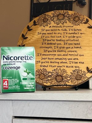 If you are under 18 years of age, ask a doctor before use. No studies have been done to show if this product will work for you. Before using this product, read the enclosed User's Guide for complete directions and other important information. Begin using the lozenge on your quit day. If you smoke your first cigarette more than 30 minutes after waking up, use 2 mg nicotine lozenge. If you smoke your first cigarette within 30 minutes of waking up, use 4 mg nicotine lozenge according to the following 12 week schedule: Weeks 1 to 6: 1 lozenge every 1 to 2 hours. Weeks 7 to 9: 1 lozenge every 2 to 4 hours. Weeks 10 to 12: 1 lozenge every 4 to 8 hours. Nicotine lozenge is a medicine and must be used a certain way to get the best results. Place the lozenge in your mouth and allow the lozenge to slowly dissolve (about 20 - 30 minutes). Minimize swallowing. Do not chew or swallow lozenge. You may feel a warm or tingling sensation. Occasionally move the lozenge from one side of your mouth to the other until completely dissolved (about 20 - 30 minutes). Do not eat or drink 15 minutes before using or while the lozenge is in your mouth. To improve your chances of quitting, use at least 9 lozenges per day for the first 6 weeks. Do not use more than one lozenge at a time or continuously use one lozenge after another since this may cause you hiccups, heartburn, nausea or other side effects. Do not use more than 5 lozenges in 6 hours. Do not use more than 20 lozenges per day. It is important to complete treatment. If you feel you need to use the lozenge for a longer period to keep from smoking, talk to your health care provider. For those who smoke their first cigarette within 30 minutes of waking up. If you smoke your first cigarette more than 30 minutes after waking up, use Nicorette 2 mg lozenge. Retain outer carton for full product uses, directions and warnings. To Increase Your Success in Quitting: 1. You must be motivated to quit. 2. Use Enough - Use at least 9 Nicorette lozenges per day during the first six weeks. 3. Use Long Enough - Use Nicorette lozenges for the full 12 weeks. 4. Use with a support program as directed in the enclosed User's Guide.Other information