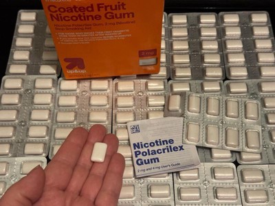 Compare to Nicorette Gum active ingredient. Double your chance to successfully quit smoking with Coated Nicotine Polacrilex Gum, 2 mg (nicotine), Fruit Flavor (when used as directed with a support program. Many people require several quit attempts to stop smoking). This is a stop smoking aid for those who smoke their first cigarette more than 30 minutes after waking up. This product is part of a Nicotine Replacement Therapy, which is designed to wean your body off cigarettes. It helps to regulate, control and gradually reduce your body's nicotine cravings. Smoking has two addictive components, a physical and a mental need for the nicotine in tobacco. Nicotine gum addresses the physical need to smoke by reducing withdrawal symptoms, including nicotine cravings. Coated for bursting flavor. Sugar free and gluten free. American Cancer Society (ACS) supports nicotine replacement therapy to help people on their journey towards a smoke-free lifestyle.