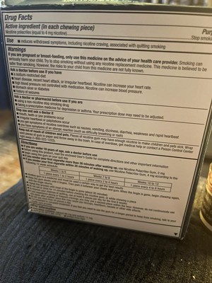 Directions if you are under 18 years of age, ask a doctor before use before using this product, read the enclosed User's Guide for complete directions and other important information begin using the gum on your quit day if you smoke your first cigarette more than 30 minutes after waking up, use Nicotine Polacrilex Gum, 2 mg if you smoke your first cigarette within 30 minutes of waking up, use Nicotine Polacrilex Gum, 4 mg according to the following 12 week schedule: Weeks 1 to 6 1 piece every 1 to 2 hours Weeks 7 to 9 1 piece every 2 to 4 hours Weeks 10 to 12 1 piece every 4 to 8 hours nicotine gum is a medicine and must be used a certain way to get the best results chew the gum slowly until it tingles. Then park it between your cheek and gum. When the tingle is gone, begin chewing again, until the tingle returns. repeat this process until most of the tingle is gone (about 30 minutes) do not eat or drink for 15 minutes before chewing the nicotine gum, or while chewing a piece to improve your chances of quitting, use at least 9 pieces per day for the first 6 weeks if you experience strong or frequent cravings, you may use a second piece within the hour. However, do not continuously use one piece after another since this may cause you hiccups, heartburn, nausea or other side effects. do not use more than 24 pieces a day it is important to complete treatment. If you feel you need to use the gum for a longer period to keep from smoking, talk to your health care provider.Other information