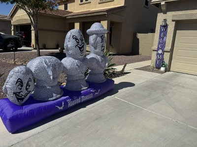 Light up the night with an Airblown® Inflatable Haunted Mansion scene! This amazing Disney inflatable features three bust characters, including one that's lost his head, atop a blue base with the Haunted Mansion logo. Programmed with a synchronized light show, the characters flash blue and white lights to tune of Grim Grinning Ghosts, a Haunted Mansion classic. Setup is super simple. Just plug it in, stake it down and watch the magic unfold. Display this Haunted Mansion Halloween inflatable as a standalone or combine it with other Airblown Inflatables to create a custom scene. Includes everything needed for easy outdoor setup.