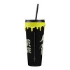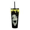 Embrace the spooky spirit of Halloween Town with this striking black Nightmare Before Christmas 26 oz acrylic drip cup. Featuring a detailed image of Oogie Boogie's face on one side and his name on the other, this cup showcases 3D molded yellow drip decor that adds a fun touch. The included black straw and lid make it perfect for enjoying your favorite beverages. Measuring 4.13" x 8.85", this acrylic cup is designed for hand washing only to maintain its vibrant design and quality.