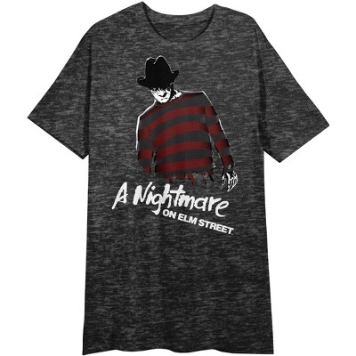 CUSTOM DESIGN: An image of Freddy Krueger wearing his iconic striped shirt and hat decorates the center of this graphic tee while white letters below him read, "A Nightmare on Elm Street." Fans of the horror film will love this fun design.