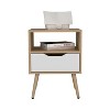 1 Drawer: Provides concealed storage for small essentials.1 Shelf: Offers easy access to frequently used items or decor.Modern Finish: Natural Oak and White for a sleek, versatile style.Compact Design: Fits perfectly in bedrooms of any size.Durable Construction: Ensures stability and long-lasting quality.Decor and setting objects are not included