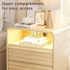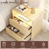 This modern nightstand, with realistic oak grain and smooth curved edges, blends style and safety. It offers ample storage: overall 15.7"D x 23.6"W x 24.8"H, with a drawer (12.8"D x 22.2"W x 3.8"H) and a spacious area for easy access to essentials. The built-in charging station has 2 AC outlets, 1 USB-A, and 1 USB-C port, perfect for bedtime device charging. Equipped with LED lights (7 DIY colors) controllable via app, it sets the right mood. A sturdy base and slatted panel design boost durability and texture.