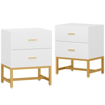 Dimensions & SpecificationsOverall dimensions per nightstand: 19.7"D x 15.7"W x 23.4"H Material: Engineered wood with white finish Set includes two identical units Special Feature: Dual-tier storage design