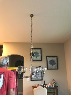 [This review was collected as part of a promotion.] I love the versatility of this light. You can hang the glass shades hanging up or down and, because the pieces are finished so well, you can also use it with or without the glass shades. It was a little difficult for my husband to install the ring that holds the glass in place, because his hand was too big. I am sure a professional would have a trick. It came packaged very well with all the pieces more than adequately protected. It gives off plenty of light and has good character with the style and the seeded glass. The only negative is a couple of the glass shades came cut a little crooked, which I am sure will be fixed with a call to the manufacturer, and I would prefer a more opaque glass so I didn't need to go buy expensive Edison style bulbs- which I still need to do.