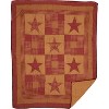 Simple nine patch blocks and primitive country stars in burgundy and dark tan create a cozy accent for classic country decor. The Ninepatch Star Quilted Throw measures 60x50 inches and adds primitive style to any sofa, chair or wall. The detailed throw blanket features a soft, quilted design. Blocks feature rustic plaids in shades of red and deep tan. The premium lap blanket is machine washable and iron safe and crafted in 100 percent cotton for a soft feel and durable wear. Reverses to a solid tan backing. Coordinates with the Ninepatch Collection by VHC for matching modern primitive window treatments, bathroom accessories and bedding to bring the best of eye-catching, traditional country style to every corner of your home.