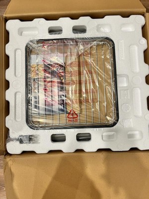 I bought this in November, right before Thanksgiving because my oven went out. It was disappointing because it can’t fit a standard 11x13 pan and I thought it would be able to cook two things at once, but the other pans aren’t wide enough to fit in the slots… needless to say, I returned it.