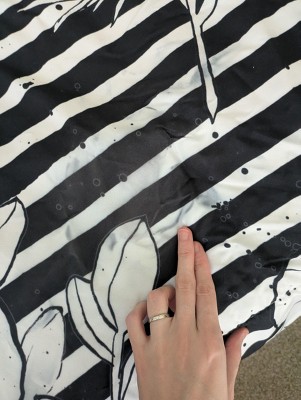 I am soo so disappointed and angry. Was really excited for this striped comforter only for it to come and appear to be re-packaged as well as stained. I gave it the benefit of the doubt and attempted to wash it, and it only made the blanket worse as now the inside stuffing is mishapen and lumpy.. and what's even more frustrating is I ordered a size 'King' and it's very obvious I received a 'Full' or 'Queen as the edge seams come no where close to the edges of my bed where they're supposed to line up. It feels cheap, like a child's sleeping bag, and it's just as noisy as one too. Really have lost faith in Target.. Do not buy this.